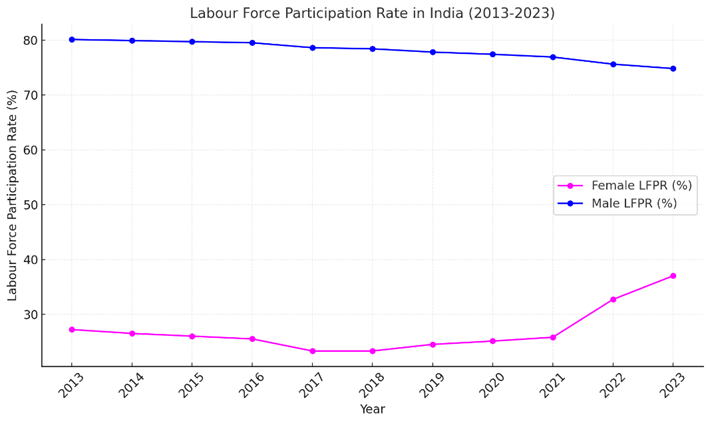 Female labour force participation (FLFP) in India remains critically low, with only about 30% of women engaged in paid employment, despite their significant potential contribution to the country’s GDP. Several factors, including socio-cultural norms, economic structures, and systemic barriers, limit women’s workforce participation in both rural and urban settings. Recent trends, however, indicate a positive shift. The female labour force participation rate (FLFPR) has increased from 32.8% in 2021-22 to 37% in 2022-23, driven by improved educational access and evolving societal norms. Notably, rural women have shown a 14% increase in participation, reflecting diminishing traditional barriers. The entry of younger, more educated women into the workforce and a gradual transition from informal to formal employment highlight significant progress. Government initiatives, such as skill development programs and entrepreneurship schemes, have played a pivotal role in this advancement. However, challenges like unpaid domestic labor, safety concerns, and occupational segregation persist. Addressing these barriers through targeted policies is essential for sustaining growth in FLFP and achieving gender equity. Unlocking the full potential of women in the workforce will be crucial for India’s inclusive economic development and social progress.